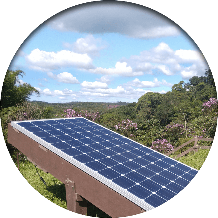 > Sistema fotovoltaico e eólico para backup de energia, com 3 horas de autonomia, que alimenta a rede de energia e iluminação, inclusive a bomba d´água que irriga as áreas administrativas do parque e o lago;
