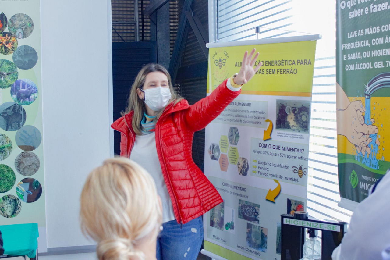 Além disso, as professoras mostraram a importância da alimentação artificial com xarope em períodos de escassez alimentar (principalmente no inverno), quando e quais são os melhores períodos do ano para efetuar a divisão das colônias foram outros destaques.