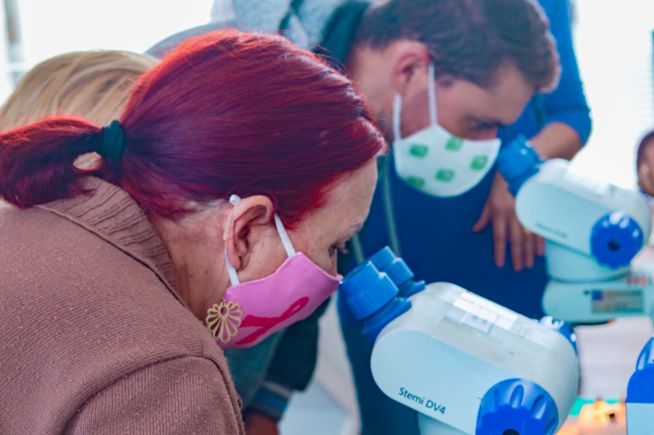 Na primeira ilha o tema foi Biodiversidade com abordagem sobre as abelhas eussociais. Para observar com detalhes as características biológicas específicas dessas abelhas, utilizou-se amostras de animais secos, vistos por meio de microscópios com lupa. “Trabalhamos com as espécies melíponas e os trigoniformes (como exemplo, Trigonas, Scaptotrigona, Oxytrigona etc) nativas do Brasil. Além dessa espécie, trouxemos as abelhas esverdeadas e azuladas que são solitárias e importantes polinizadoras”, explica a professora Michelle.