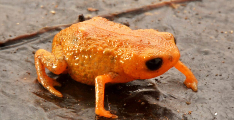 Encontrado pela primeira vez em 2016, mas somente descrito em artigo científico no final de 2025, este pequeno anfíbio de cor laranja brilhante e comportamento diurno (incomum para sapos) vive escondido sob a serrapilheira – a camada de folhas e matéria orgânica – no topo das montanhas da Mata Atlântica. Seu coaxar, que mais parece o canto de um grilo, é a pista que os cientistas usaram para localizá-lo em meio à floresta.